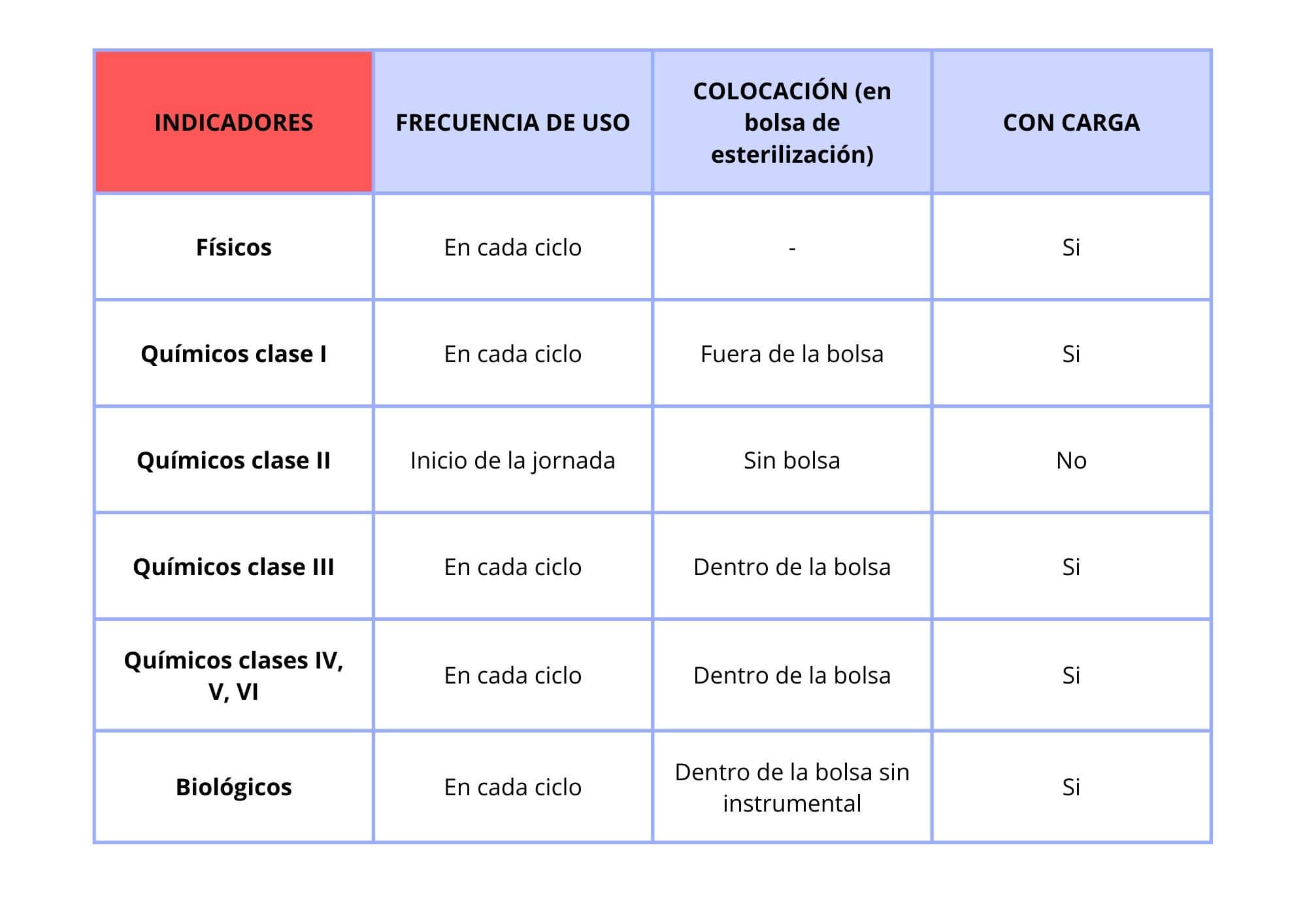 | INDICADORES | FRECUENCIA DE USO | COLOCACIÓN EN AUTOCLAVE (bolsa de esterilización) | CON CARGA |